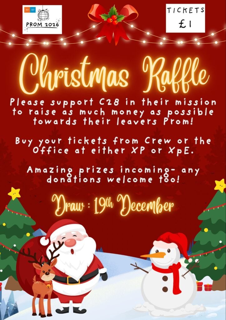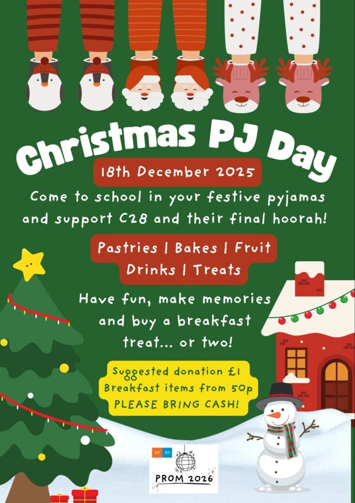 On December 18th, we’ll be having a Christmas PJ day – long PJs, be as festive as possible – £1 donation towards C28’s prom – along with a breakfast goodies sale during crew.