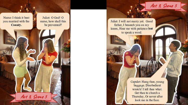 Desperate to avoid marrying Paris, Juliet turns to Friar Laurence, who gives her a potion that will make her appear dead for 42 hours. The plan is for her to be laid in the Capulet tomb, then awaken and escape with Romeo. Juliet drinks the potion, and her family, believing her dead, prepares her funeral.