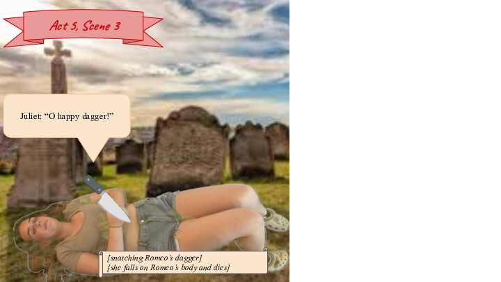 Romeo, not knowing of the Friar’s plan, hears that Juliet has died and returns to Verona. He buys poison, goes to her tomb, and kills himself beside her body. When Juliet awakens and finds Romeo dead, she stabs herself with his dagger. Their deaths finally reconcile the Montagues and Capulets, ending the feud but at a terrible cost.
